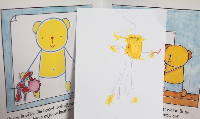 Сигурно има много начини, с които ние, родителите, може да помогнем на детето да се научи да рисува прости фигури. За нас това направи една малка книжка на холандски, която открихме в близката библиотека. С нея се научихме да рисуваме Мече.