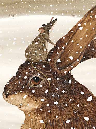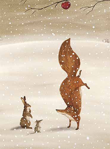 Зайче, мишле, лисица, мечка, студ, сняг, храна, ябълка, плод, дърво.