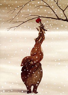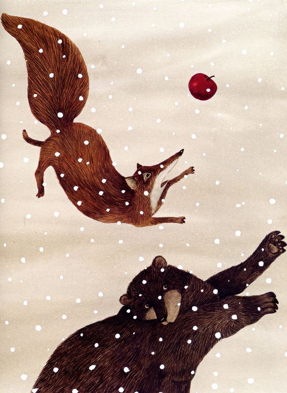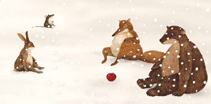 Зайче, мишле, лисица, мечка, студ, сняг, храна, ябълка, плод, дърво.